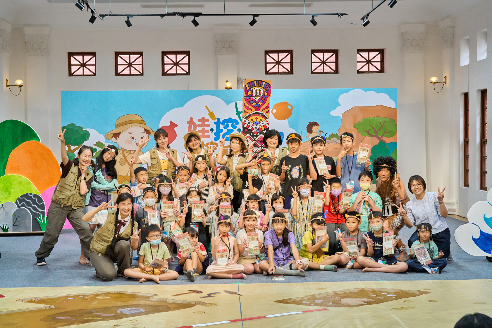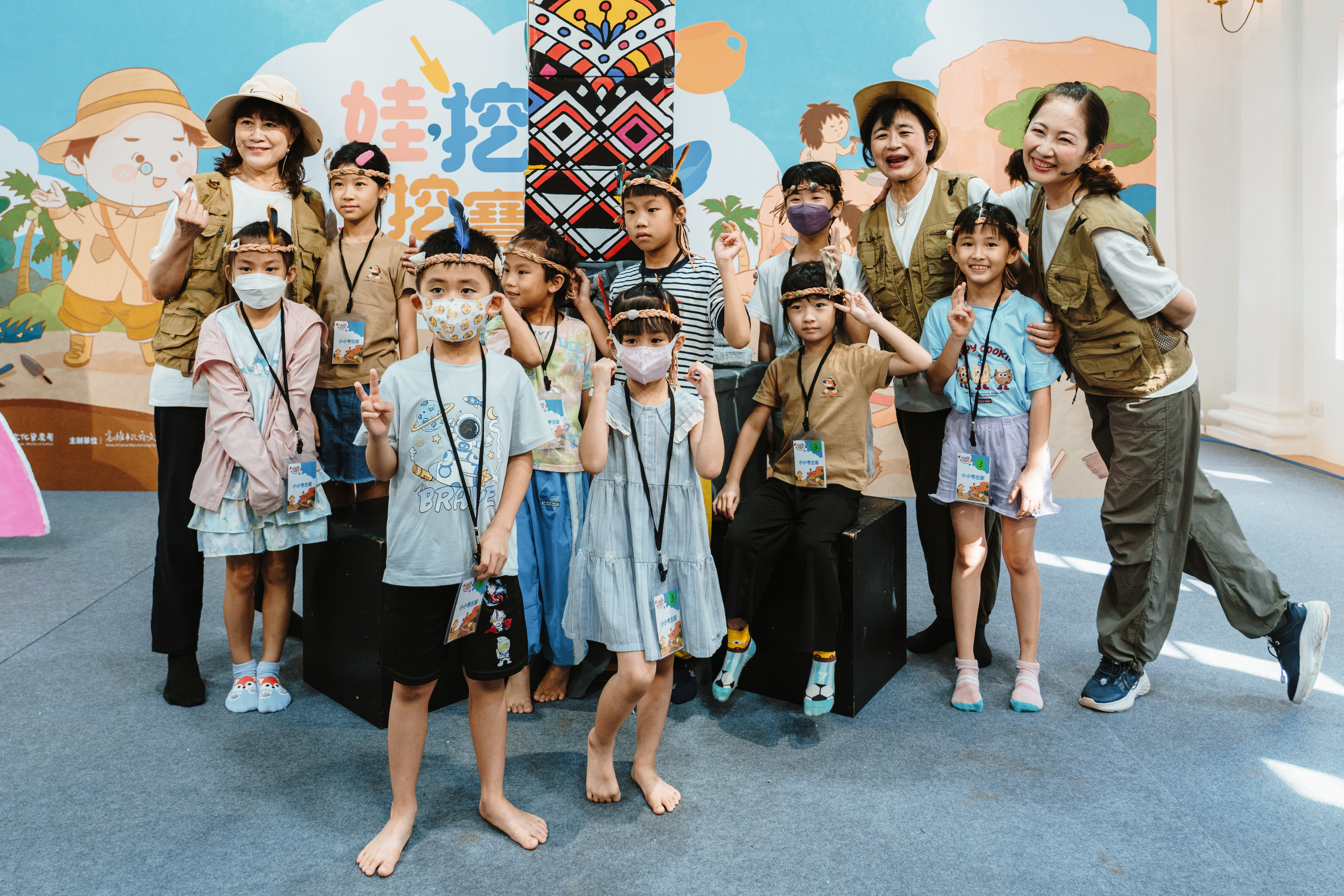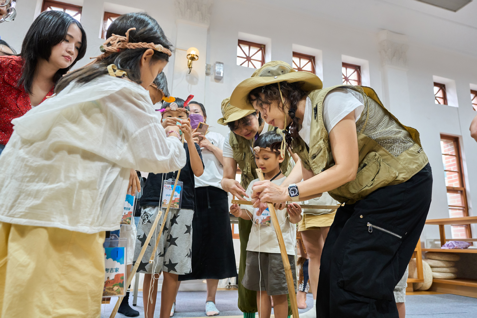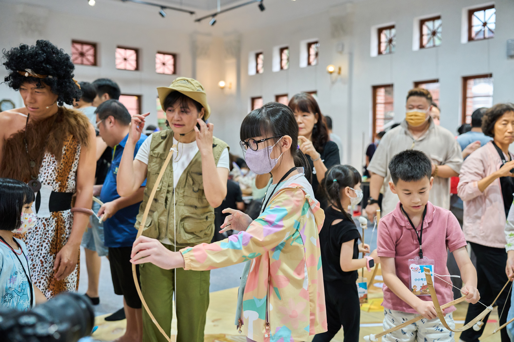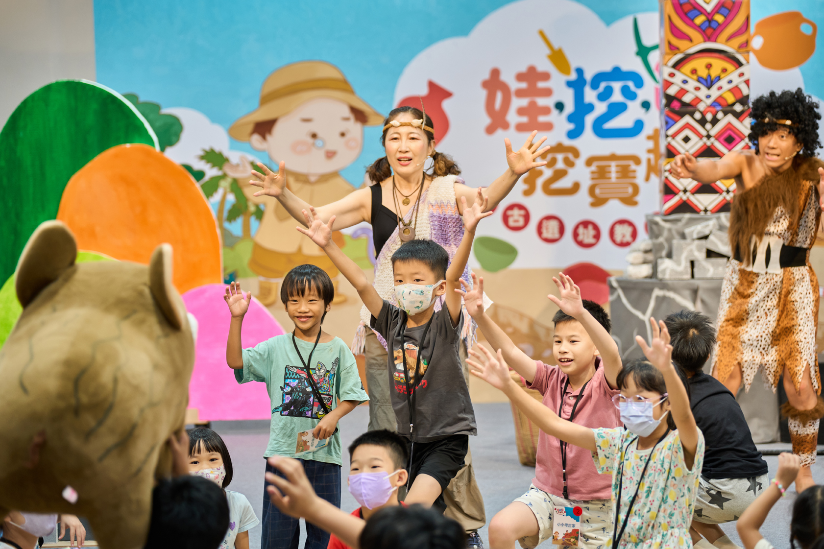 除戲劇演出外,現場更設有三大闖關體驗:「穿針引線」讓學童模擬陶紡輪的編織技術,親手製作史前風格的頭飾;「箭不虛發」體驗先民狩獵技能,挑戰命中標靶;「祕寶挖掘」重現考古現場,學童戴上護目鏡與手套,親自挖掘土塊中的「史前遺物」。
