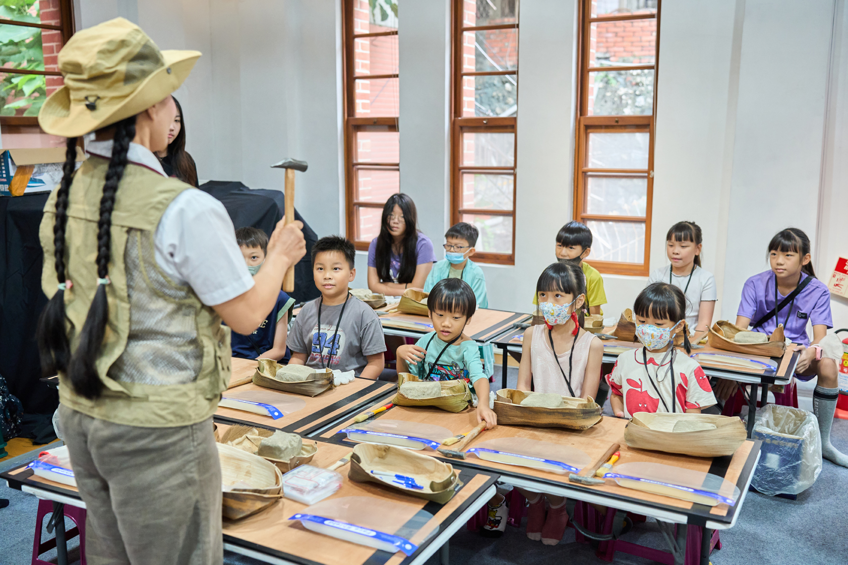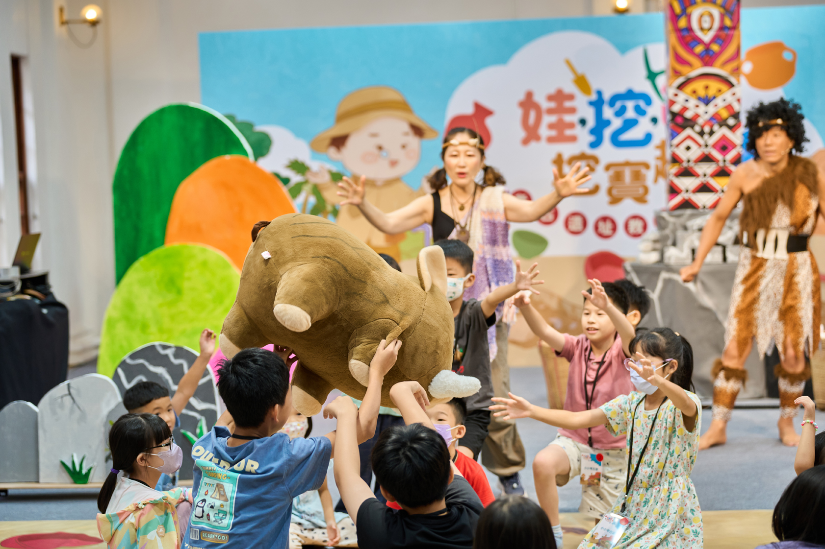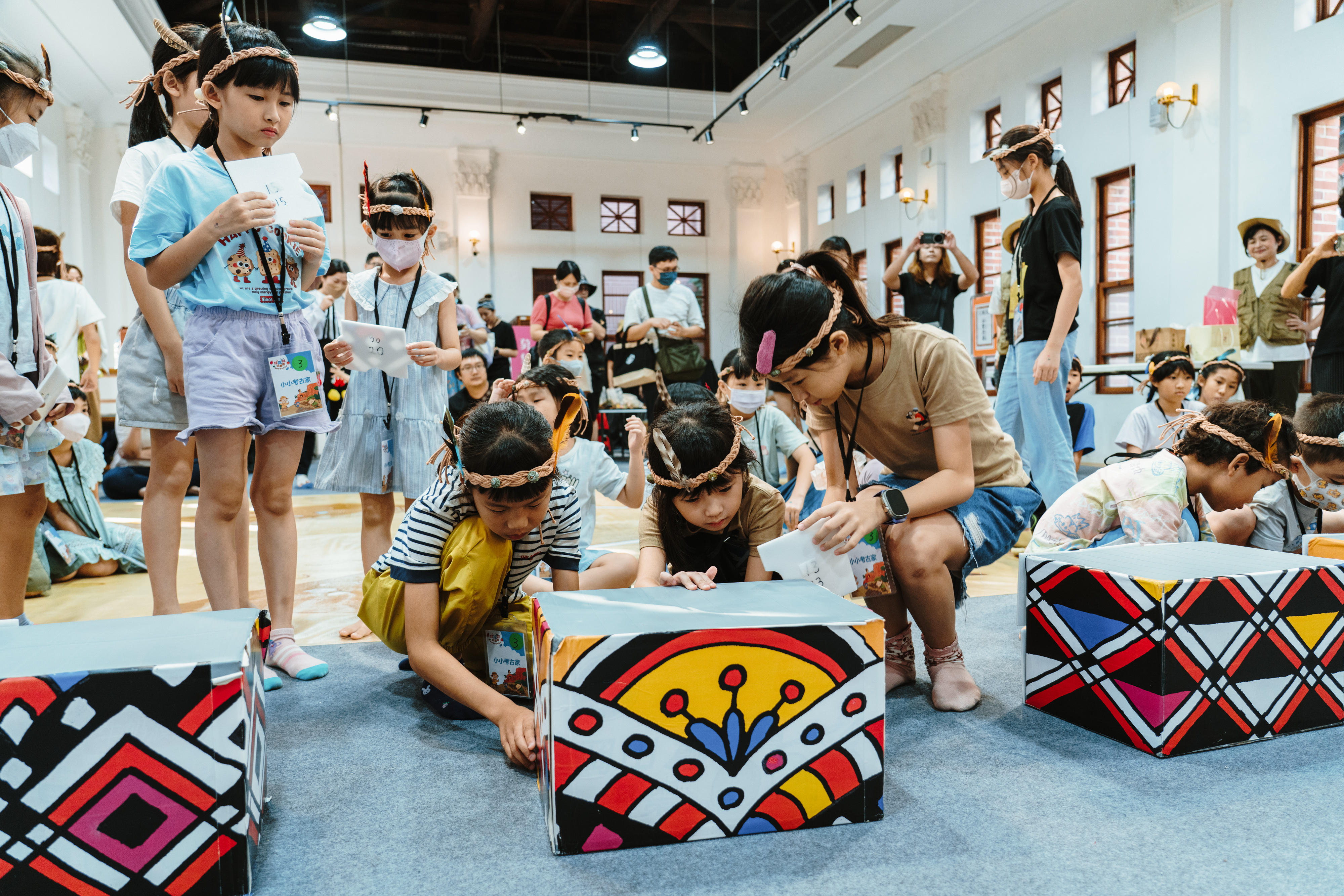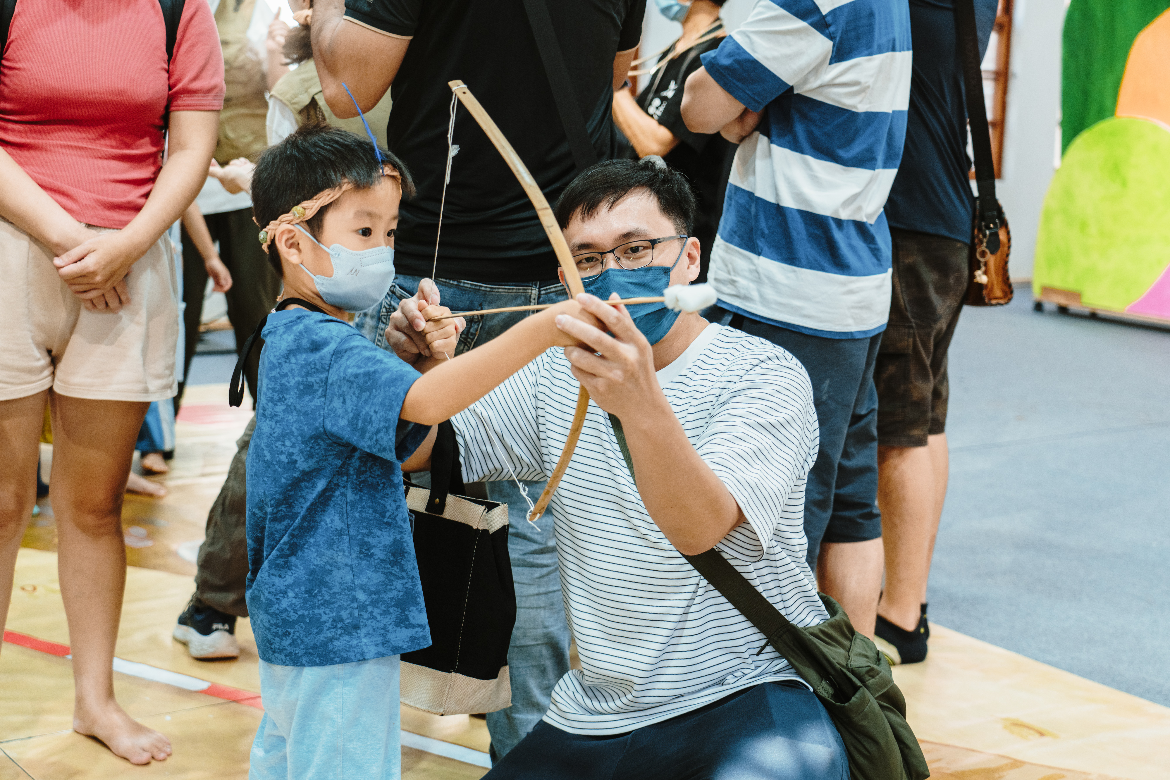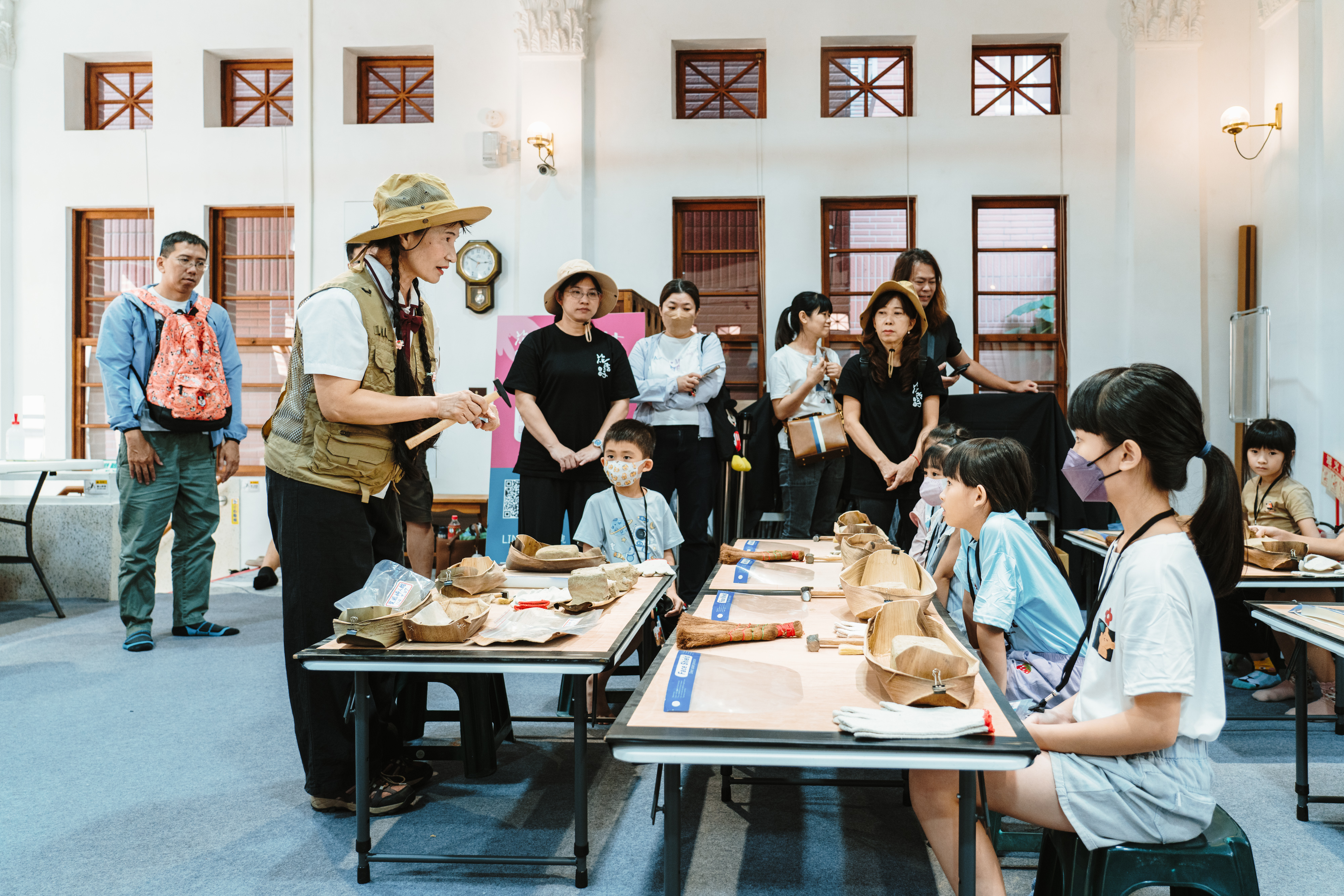 除戲劇演出外,現場更設有三大闖關體驗:「穿針引線」讓學童模擬陶紡輪的編織技術,親手製作史前風格的頭飾;「箭不虛發」體驗先民狩獵技能,挑戰命中標靶;「祕寶挖掘」重現考古現場,學童戴上護目鏡與手套,親自挖掘土塊中的「史前遺物」。