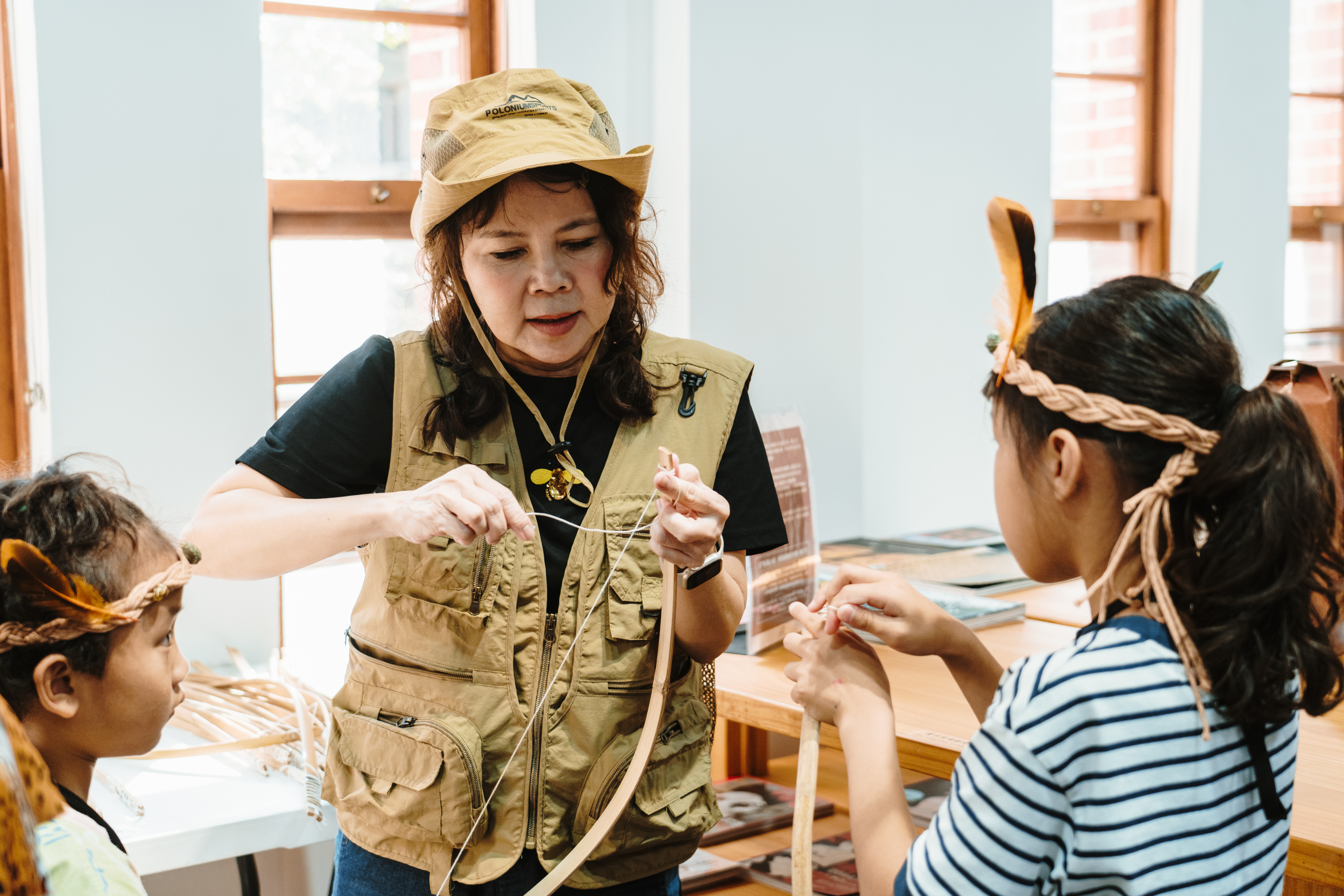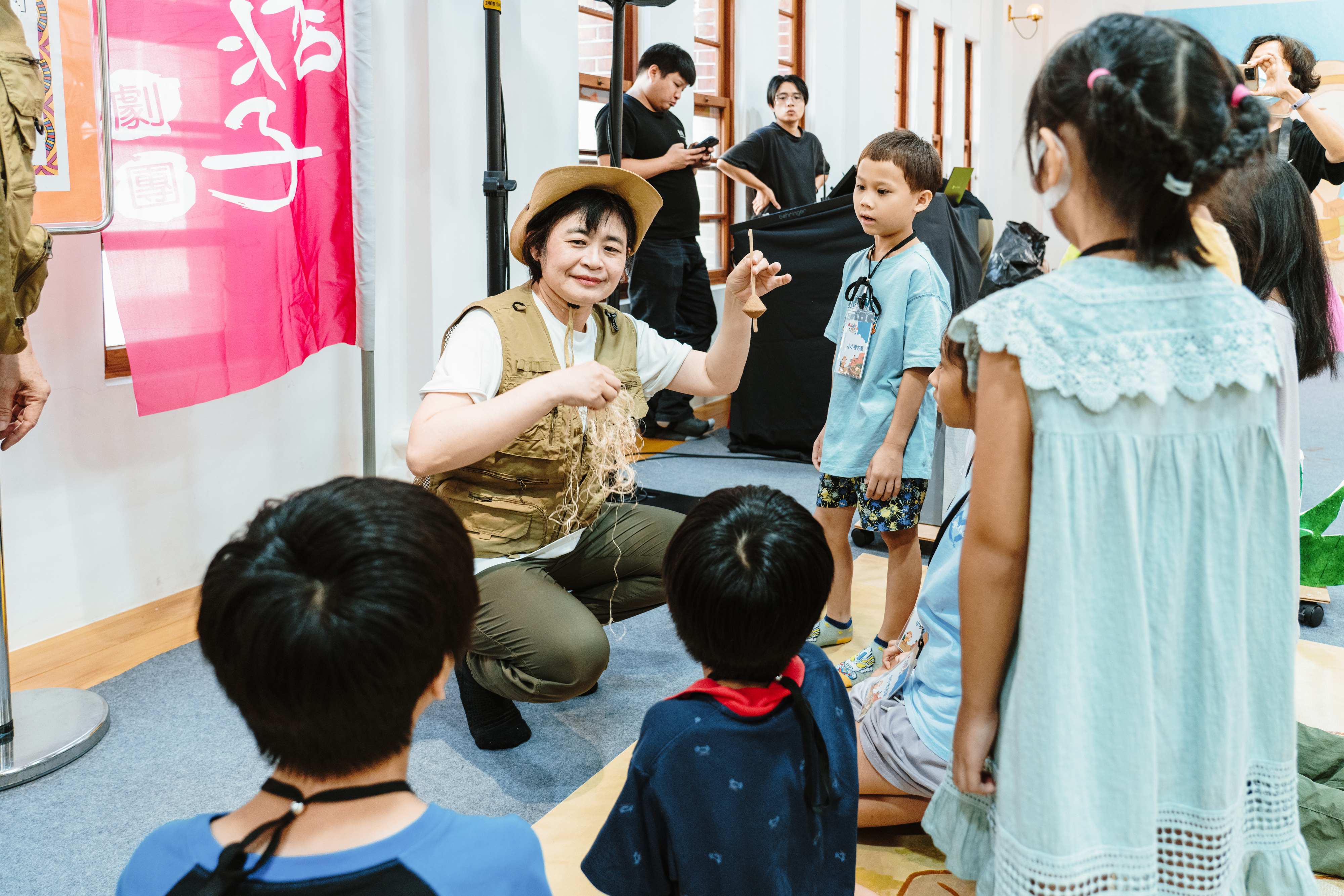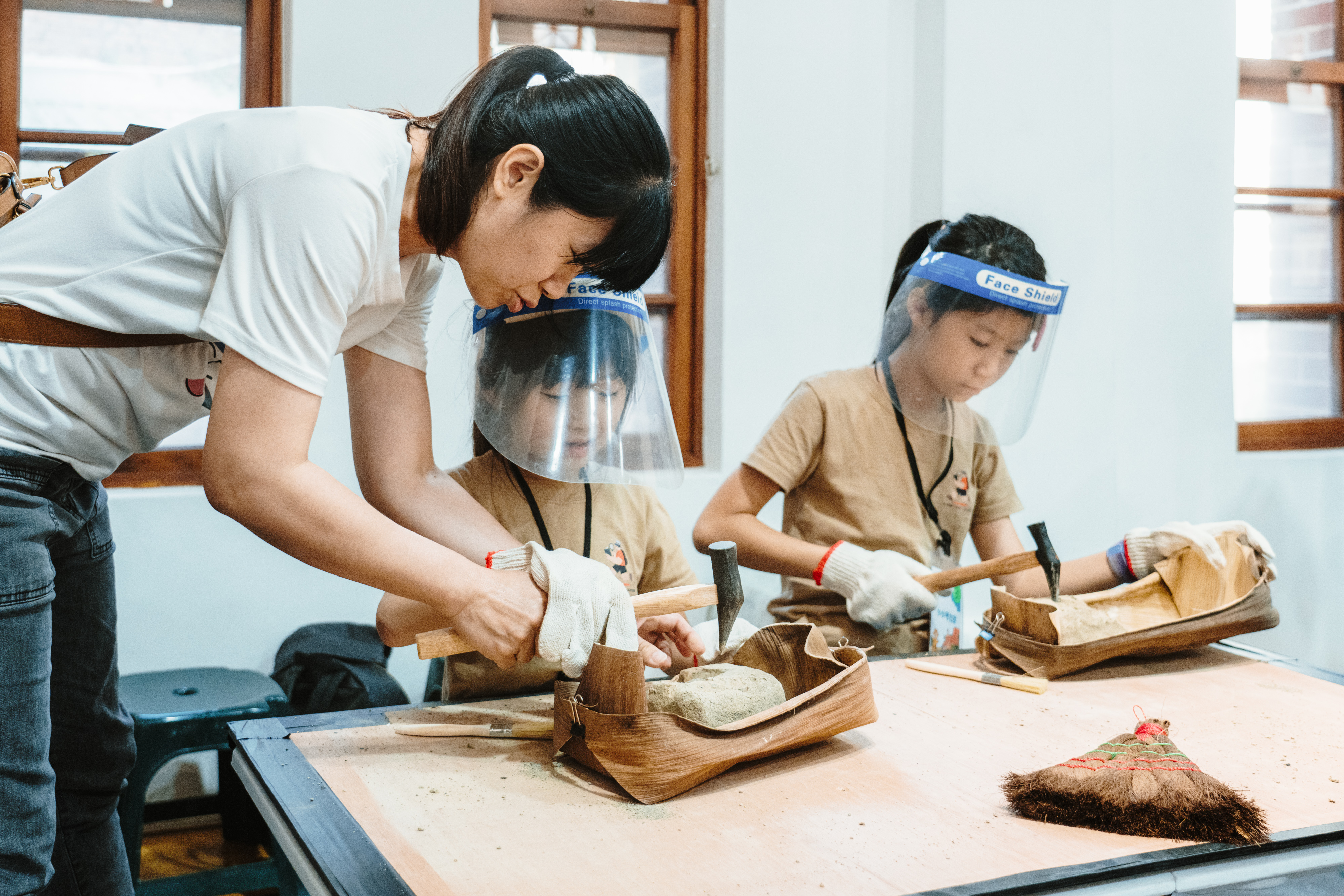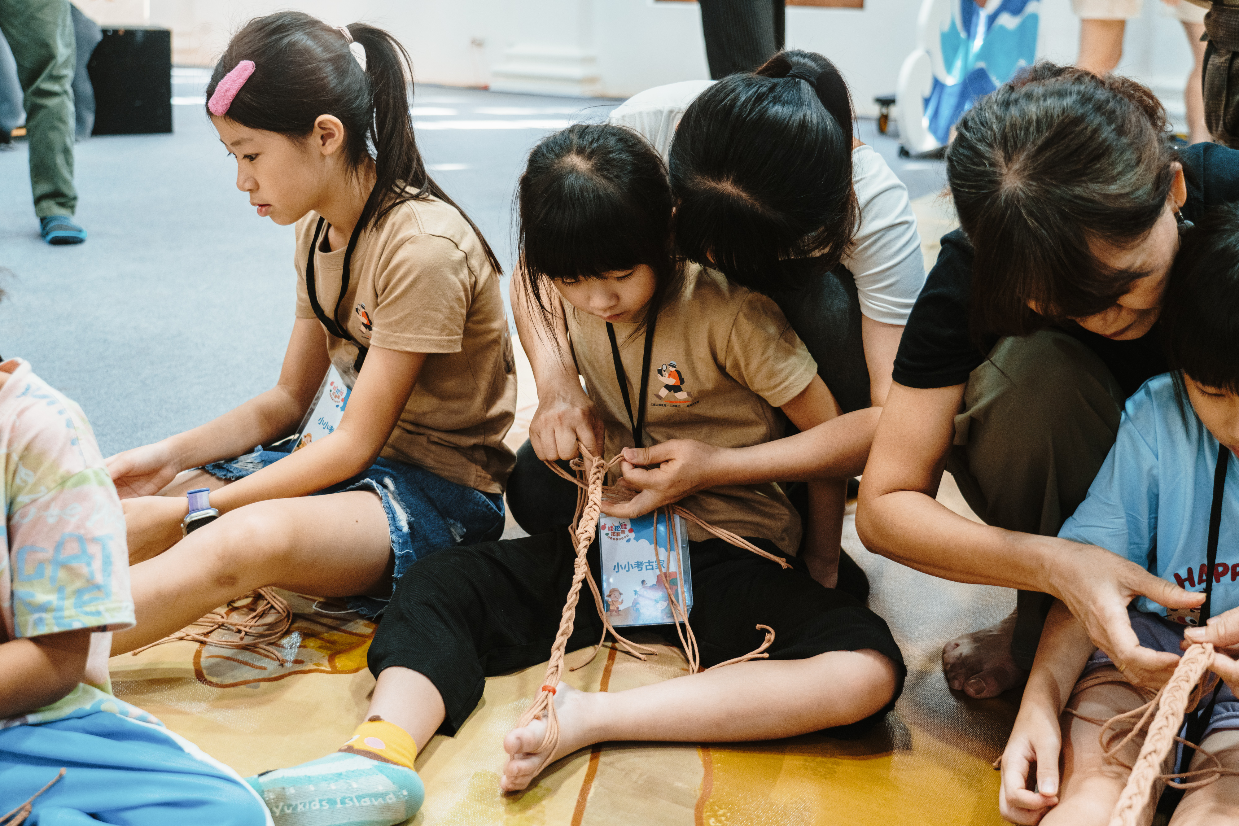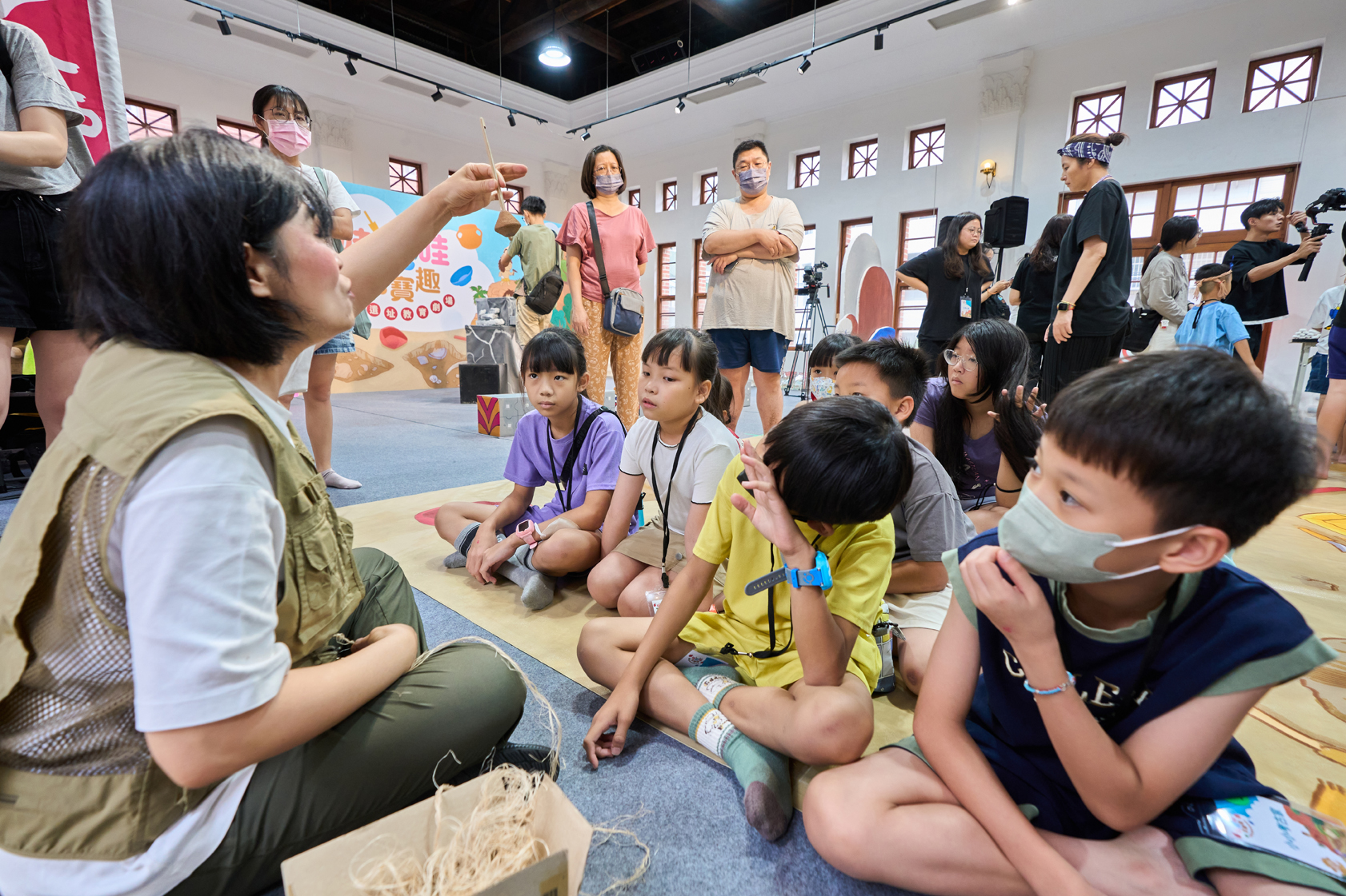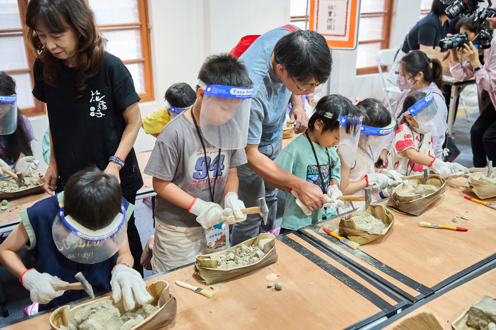 除戲劇演出外,現場更設有三大闖關體驗:「穿針引線」讓學童模擬陶紡輪的編織技術,親手製作史前風格的頭飾;「箭不虛發」體驗先民狩獵技能,挑戰命中標靶;「祕寶挖掘」重現考古現場,學童戴上護目鏡與手套,親自挖掘土塊中的「史前遺物」。