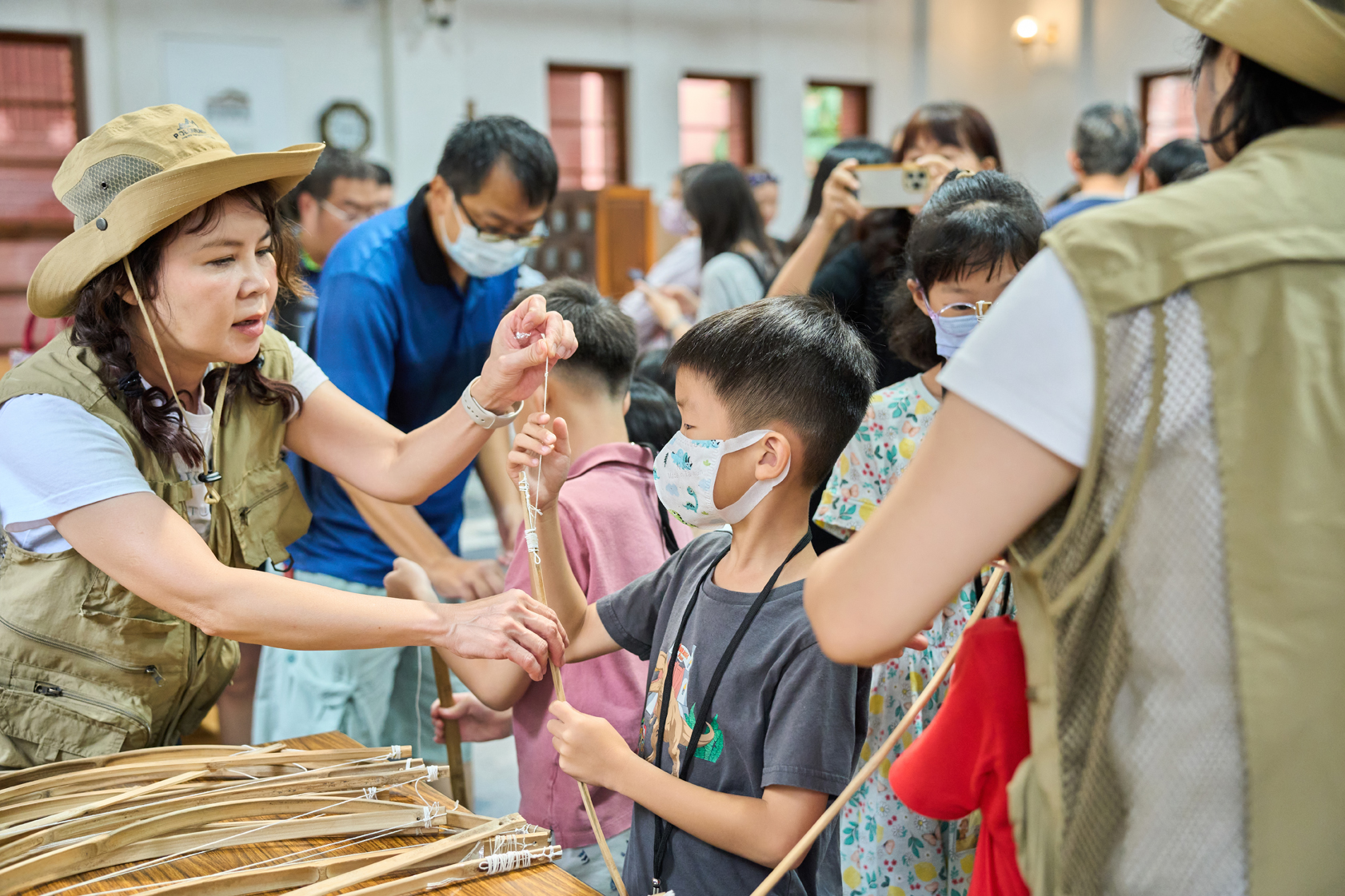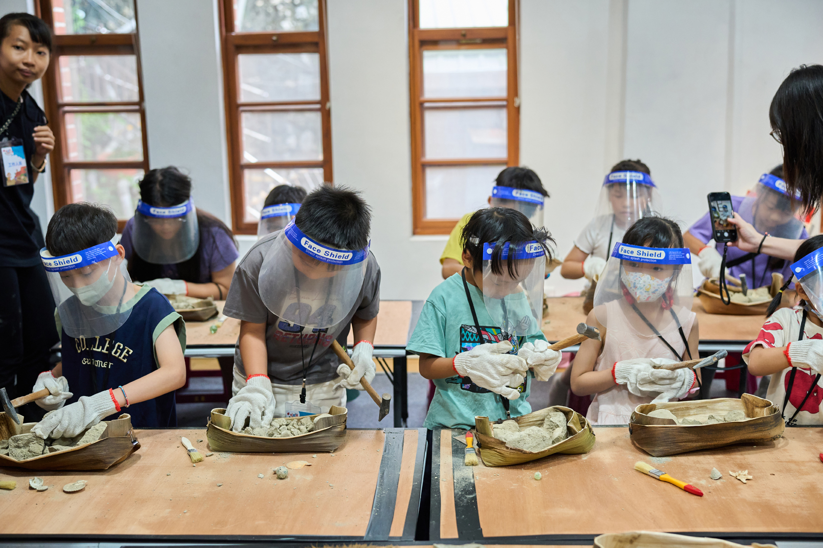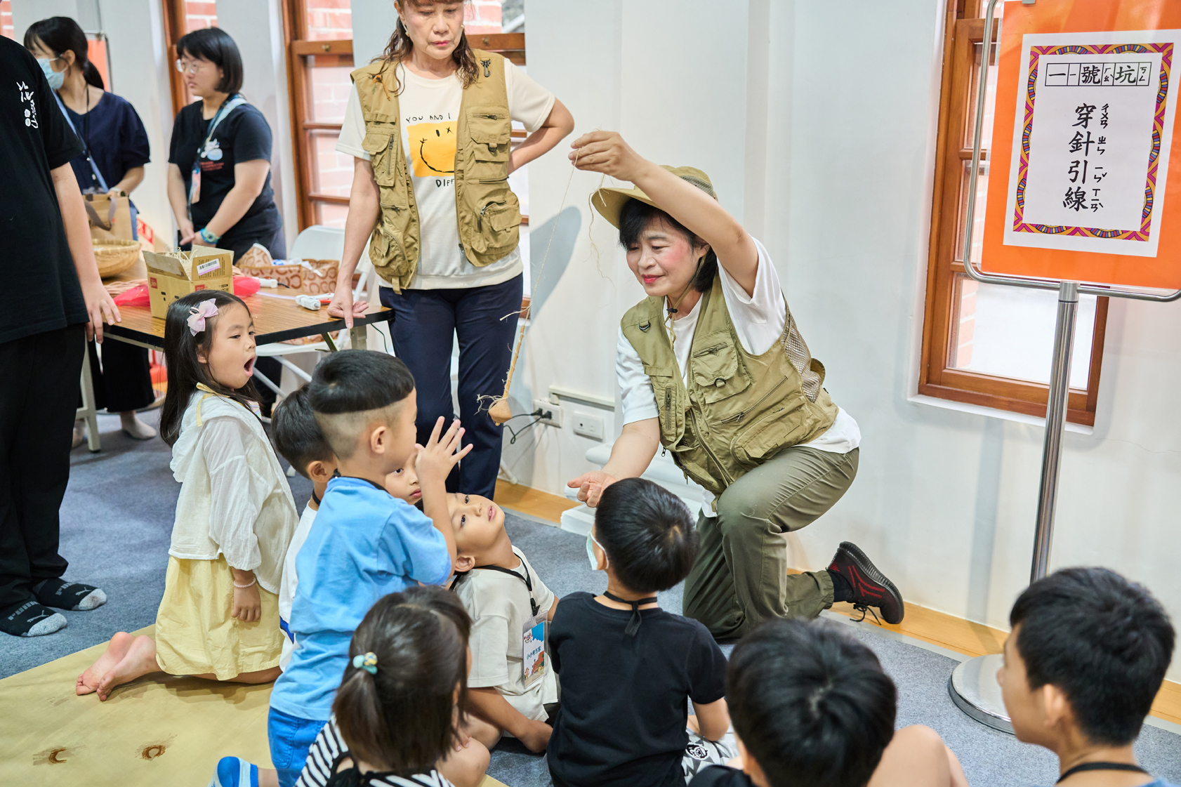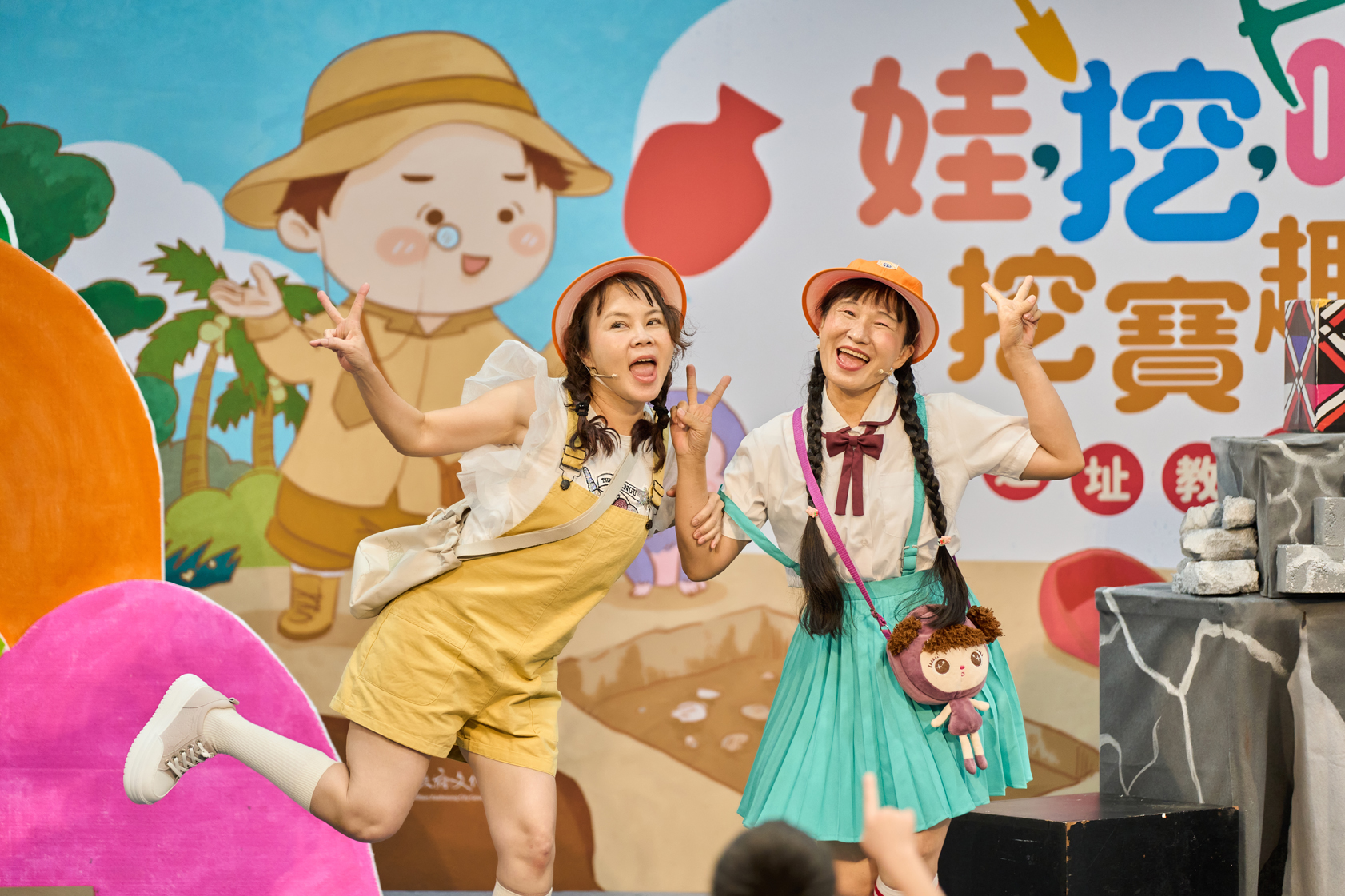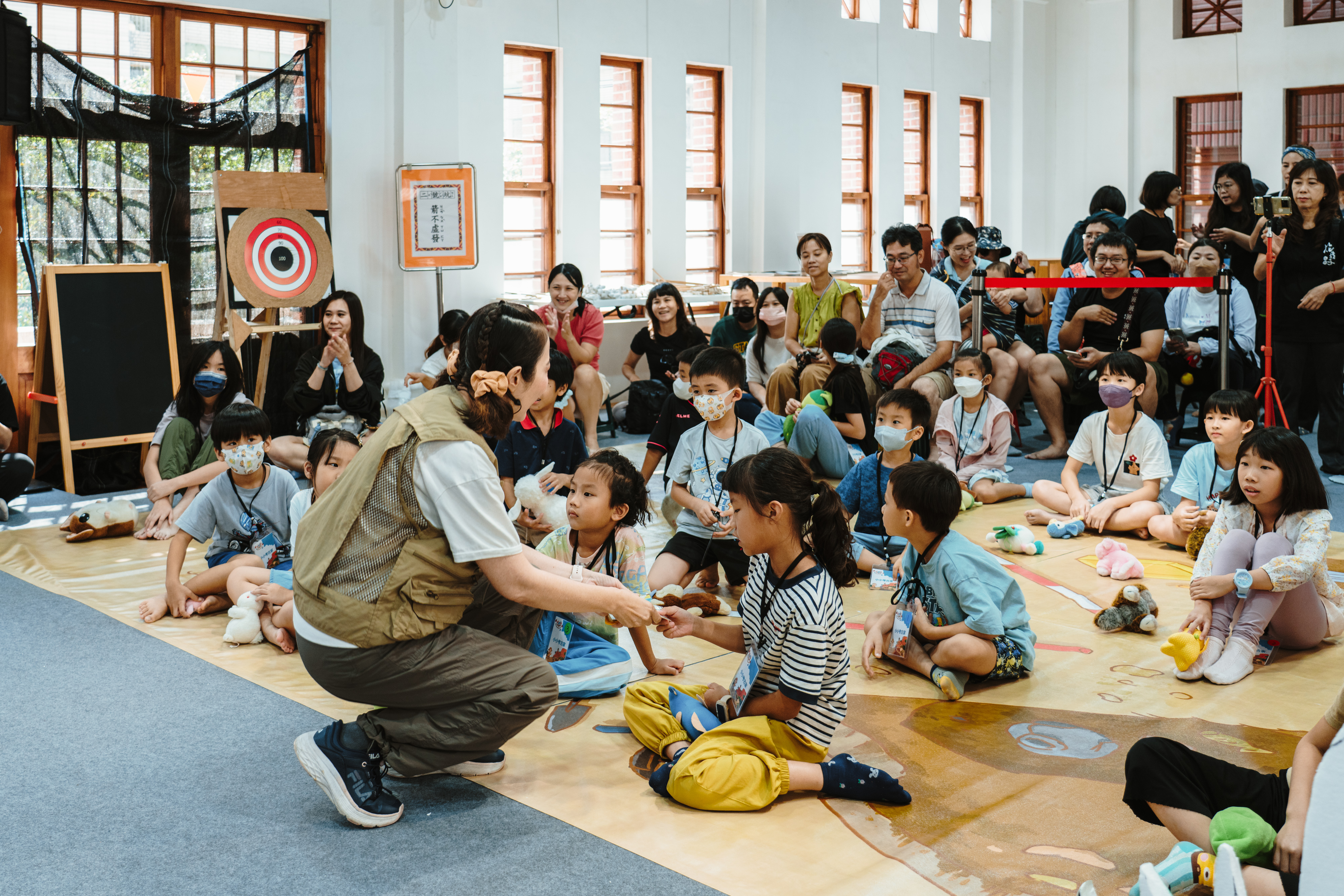 除戲劇演出外,現場更設有三大闖關體驗:「穿針引線」讓學童模擬陶紡輪的編織技術,親手製作史前風格的頭飾;「箭不虛發」體驗先民狩獵技能,挑戰命中標靶;「祕寶挖掘」重現考古現場,學童戴上護目鏡與手套,親自挖掘土塊中的「史前遺物」。