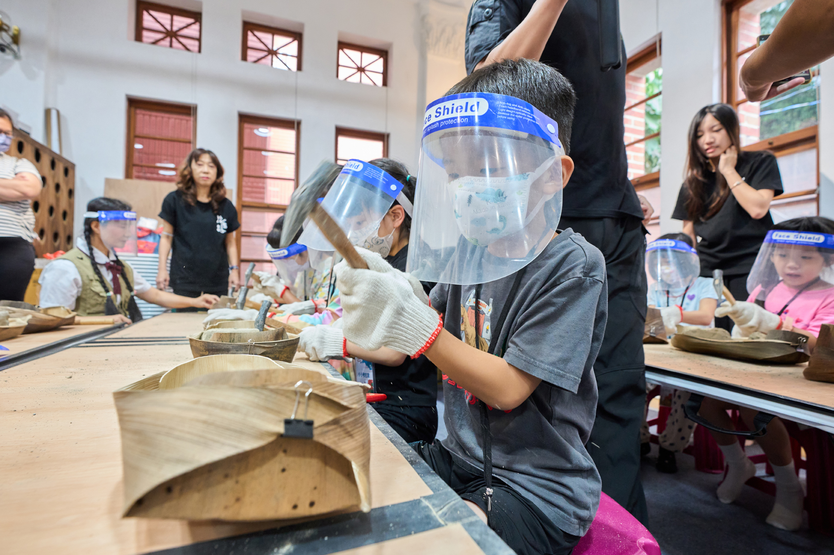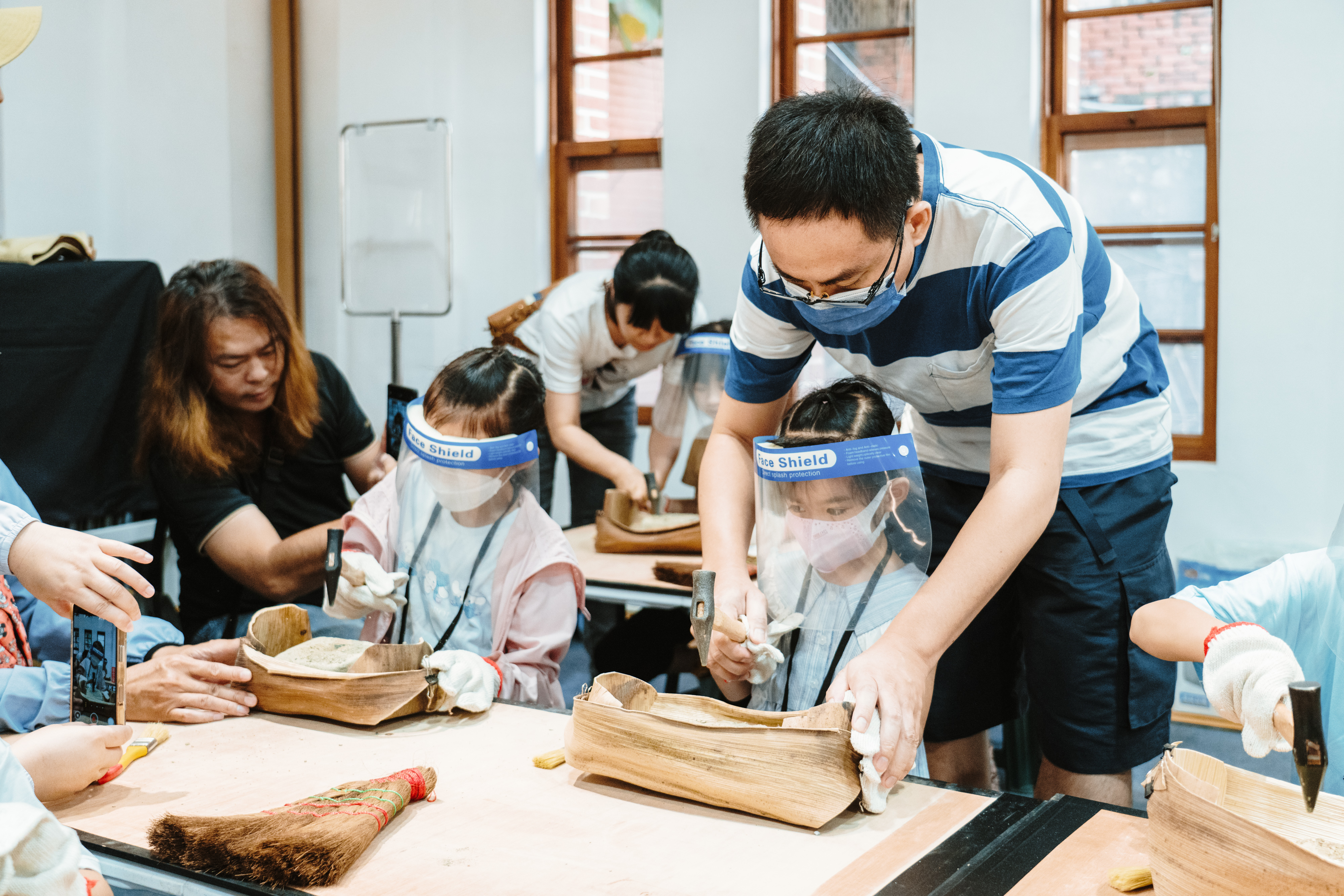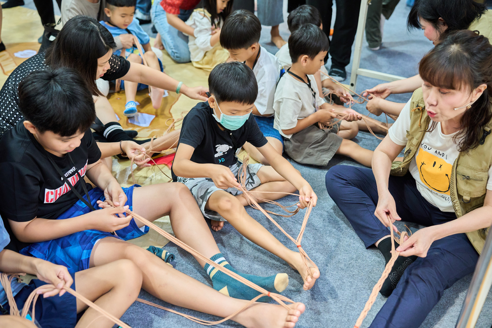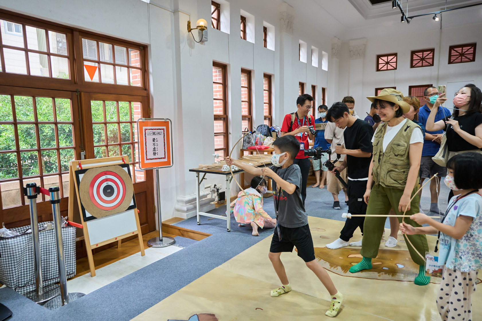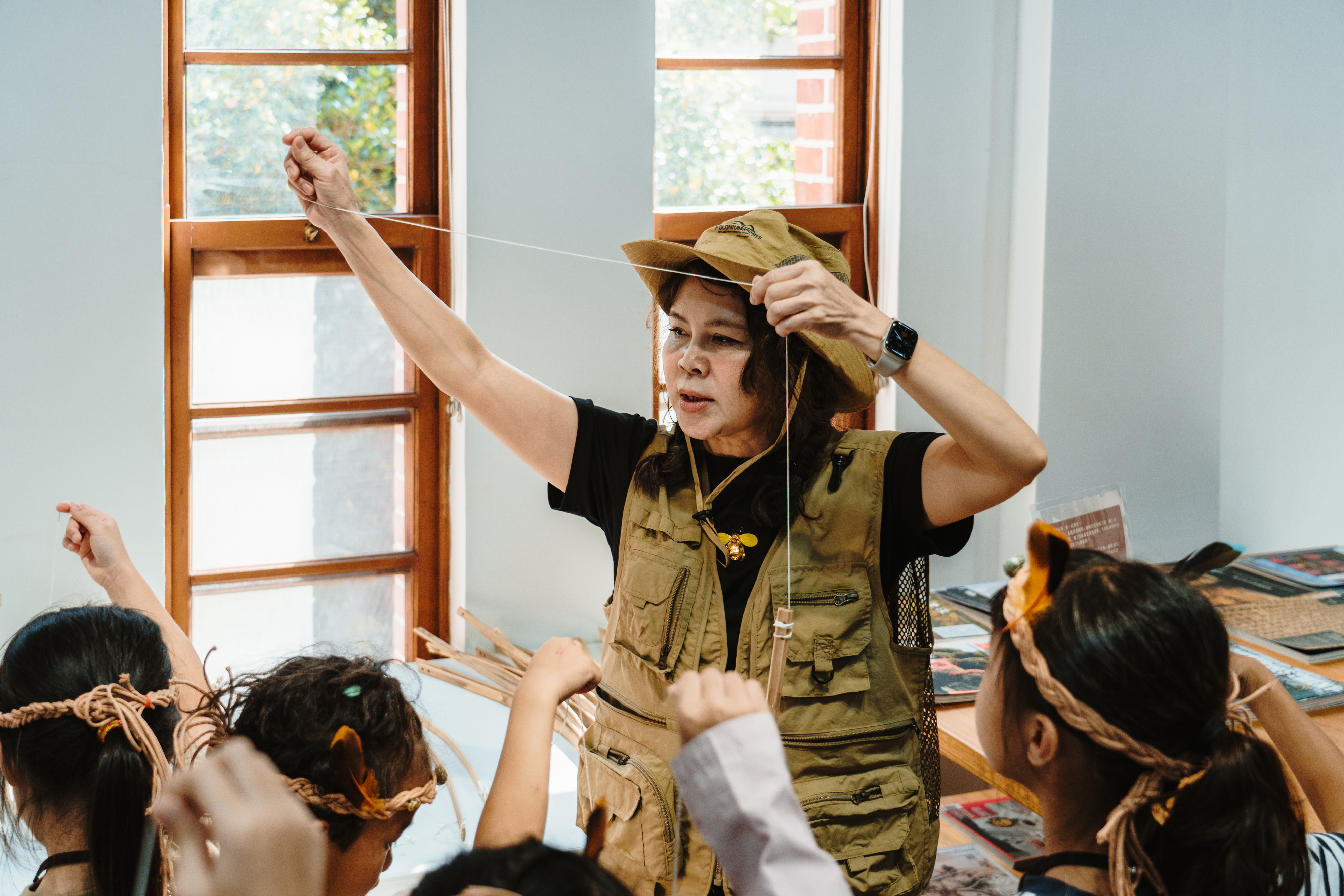 除戲劇演出外,現場更設有三大闖關體驗:「穿針引線」讓學童模擬陶紡輪的編織技術,親手製作史前風格的頭飾;「箭不虛發」體驗先民狩獵技能,挑戰命中標靶;「祕寶挖掘」重現考古現場,學童戴上護目鏡與手套,親自挖掘土塊中的「史前遺物」。