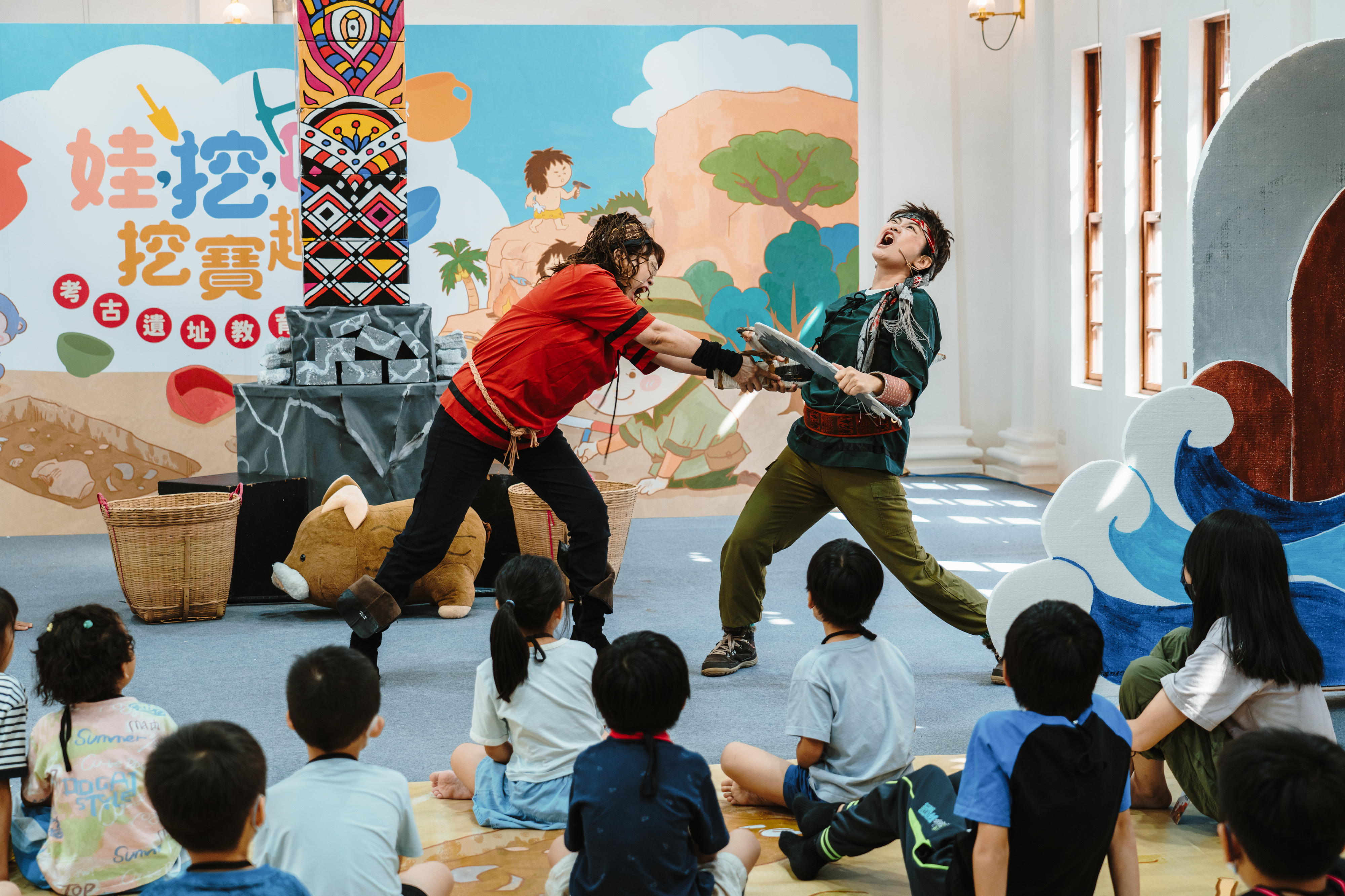 為推廣高雄市豐富的考古遺址文化,並以創新形式深化民眾對史前文化的理解,本局於 2025 年 7 月 5 日與 9 月 27 日分別舉辦兩場「娃·挖·哇!挖寶趣」考古遺址教育劇場,地點設於高雄原愛國婦人會館,共計吸引約 60 位國小學童參與。活動以戲劇表演結合闖關體驗,將考古遺址知識轉化為趣味互動,讓學童們在遊戲與故事中自然學習文化資產的價值。